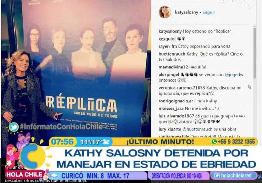 La noche de este miércoles Katherine Salosny fue detenida por manejar en estado de ebriedad y llevada a la 18ª Comisaría de Ñuñoa. Todo esto tras salir del estreno de la obra "Réplica", protagonizada por Paola Volpato, Patricia Rivadeneira y Francisco Pérez-Bannen.