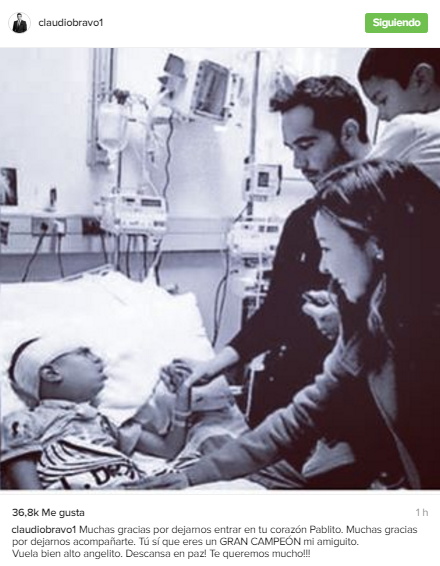 Pablo, un niño con una complicada enfermedad que conoció a Bravo, cumpliendo uno de sus grandes sueños, falleció. "Muchas gracias por dejarnos entrar en tu corazón Pablito. Muchas gracias por dejarnos acompañarte. Tú sí que eres un GRAN CAMPEÓN mi amiguito. Vuela bien alto angelito. Descansa en paz! Te queremos mucho!!!", escribió el portero junto a una imagen donde se le ve visitándolo en el hospital.