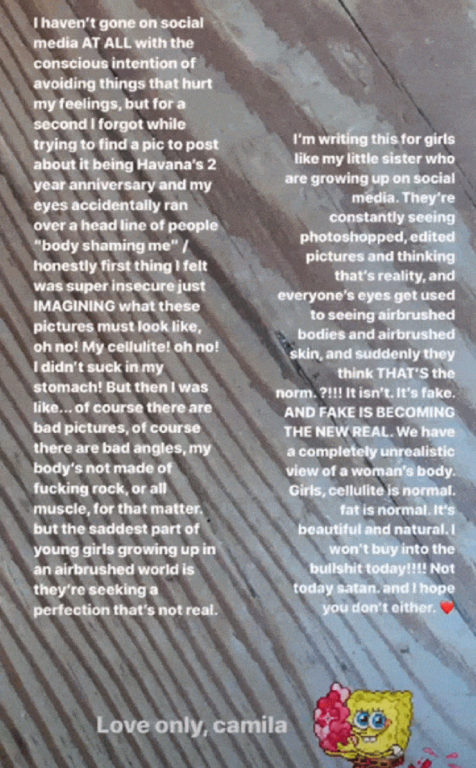 A continuación, Camila Cabello aprovechó la oportunidad para entregar una reflexión acerca de los estereotipos, dejando un mensaje a sus seguidores más jóvenes. “Mi cuerpo no está hecho de una jodida piedra, pero lo triste para todas las jóvenes es crecer en un mundo donde la perfección no es real”, puso.