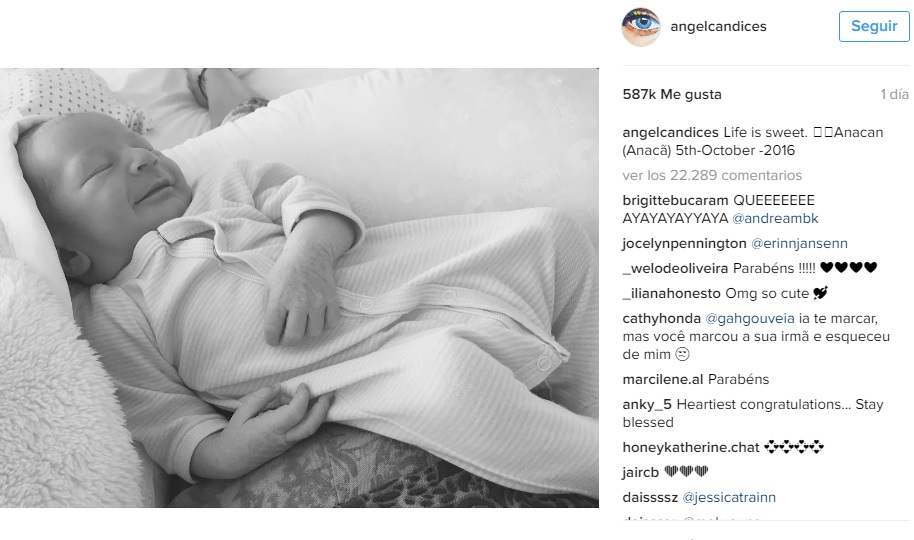 Según informa la Revista "Hola" la propia modelo publicó un emotivo mensaje en las redes sociales junto a la primera foto de su bebé durmiendo,, cuyo nombre es Anacã.