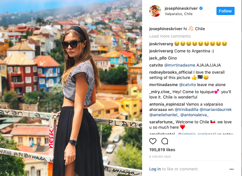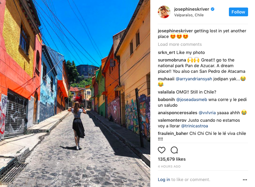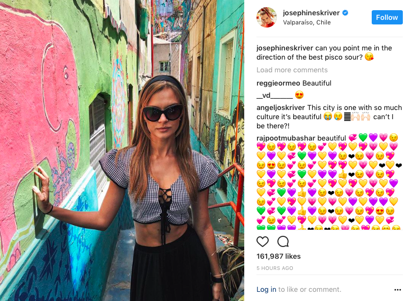A través de su cuenta de Instagram, la modelo de 24 años, ha compartido distintas postales de los clásicos cerros y murales que se pueden conocer en la Quinta Región. Pero Josephine no sólo ha disfrutado de los paisajes, porque también contó que le encantó el pisco sour y la piscola.