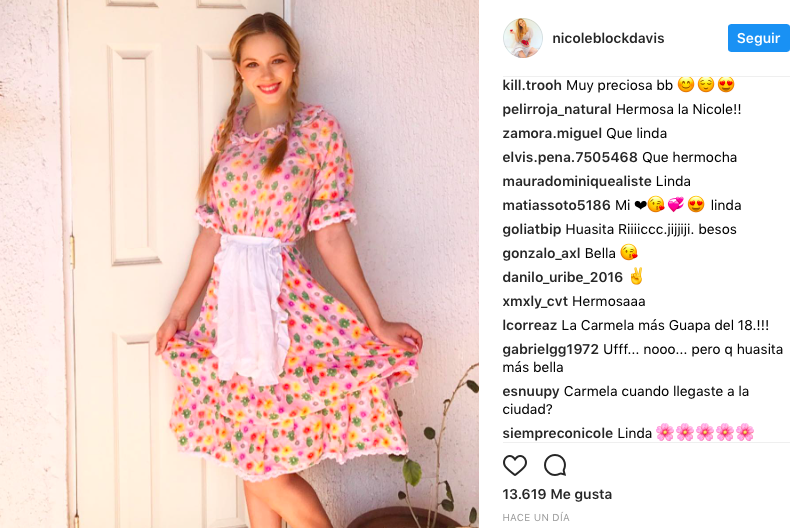"Qué linda te ves", "Ese traje te queda muy bien", "la más guapa del 18" fueron algunos de los comentarios que recibió la actriz Nicole Block a través de su cuenta de Intagram luego de que publicara una foto con un atuendo típico del 18.