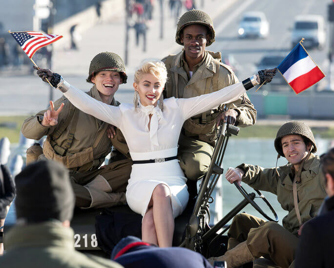 En las imágenes sale junto a supuestos soldados de la Segunda Guerra Mundial sosteniendo las banderas francesa y estadounidense y usando un traje blanco.