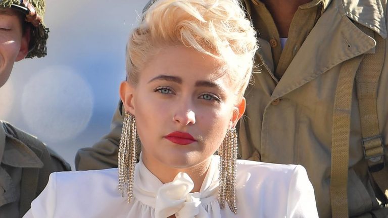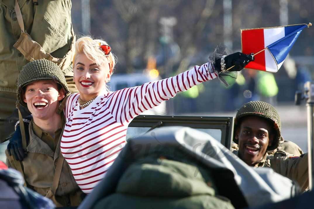 En las imágenes sale junto a supuestos soldados de la Segunda Guerra Mundial sosteniendo las banderas francesa y estadounidense y usando un traje blanco.