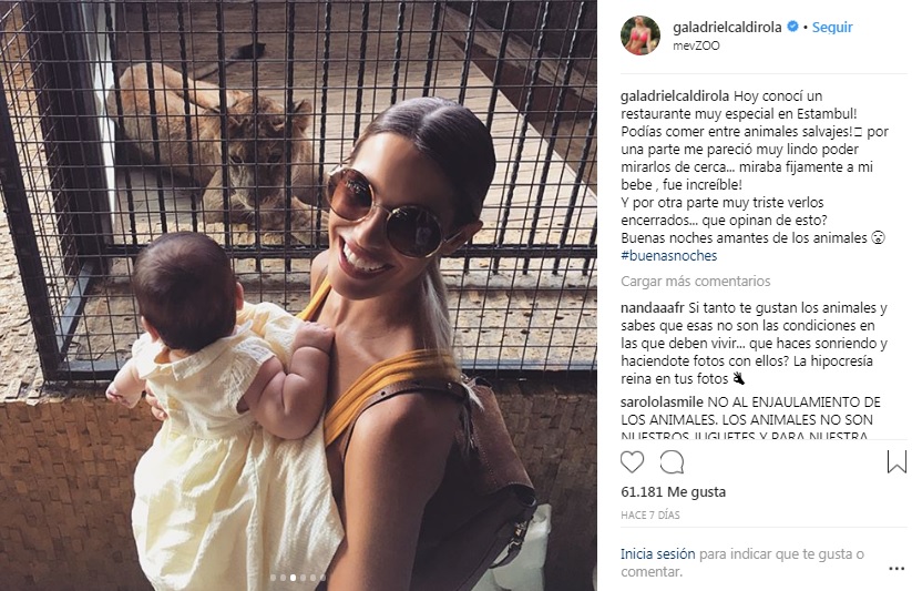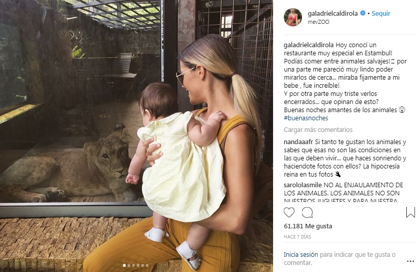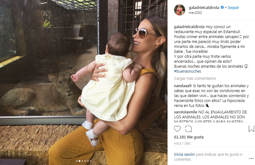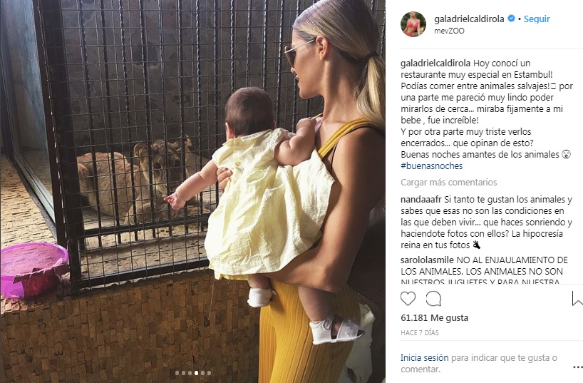 Tal fue el caso de una de sus últimas publicaciones, donde aparece con su pequeña hija Luz. ¿Cuál fue el problema de la imagen? Es que sale junto a una serie de animales encerrados. "Hoy conocí un restaurante muy especial en Estambul! Podías comer entre animales salvajes! Por una parte me pareció muy lindo poder mirarlos de cerca... miraba fijamente a mi bebe , fue increíble!", explica Gala.