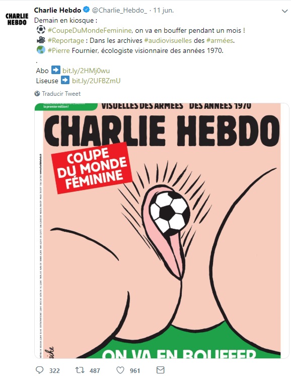 Qué tan misóginos hay que ser para desvalorar y pisotear de esta manera todo el trabajo, el talento y la profesionalidad que las 552 jugadoras del #MundialFrancia2019 #FIFAWWC han mostrado dentro y fuera de la cancha? Repugnante #CharlieHebdo. pic.twitter.com/1Xl7rJpBPs