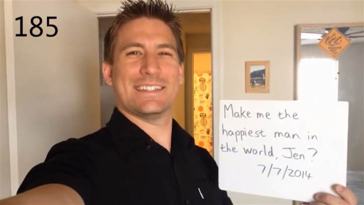 Dean elaboró un plan en el que llevó a su novia Jennifer a la playa, en Aruba. Era el cumpleaños de ella. Allí, la sentó y le mostró lo que había hecho por un año: preguntarle en un cartelito, cada día del año, si quería casarse con él.