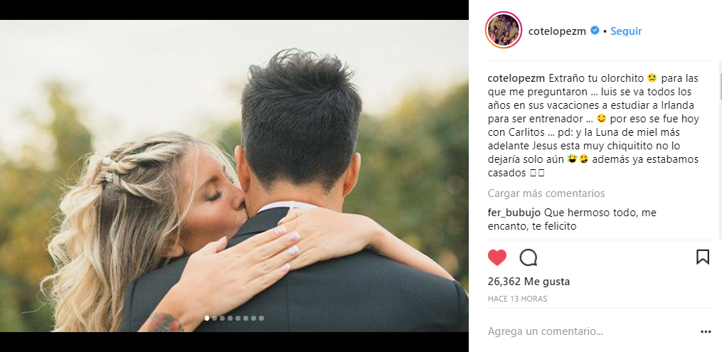 "Extraño tu olorchito 😢 para las que me preguntaron ... luis se va todos los años en sus vacaciones a estudiar a Irlanda para ser entrenador ... 😊 por eso se fue hoy con Carlitos ... pd: y la Luna de miel más adelante Jesus esta muy chiquitito no lo dejaría solo aún 😰😳 además ya estabamos casados", escribió en sus redes sociales.