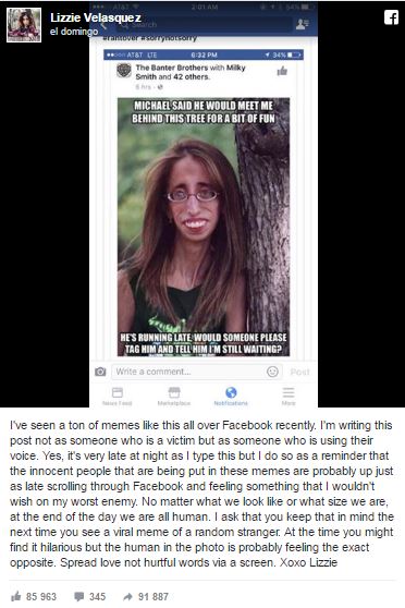 "He visto toneladas de memes como este en Facebook últimamente. Estoy escribiendo esta publicación no como víctima sino como alguien que simplemente está utilizando su voz. Sí, es muy tarde pero lo hago como un recordatorio de que personas inocentes están siendo protagonistas de estos memes, probablemente están revisando Facebook hasta tarde y están sintiendo algo que yo no desearía ni a mi peor enemigo. No importa cómo luzcas ni la talla de ropa que uses, al final del día todos somos humanos. Les pido que tengan eso en mente la próxima vez que vean un meme con un extraño como protagonista. En ese momento podrías encontrarlo hilarante, pero la persona de la foto probablemente está sintiendo todo lo contrario. Difundan palabras de amor y no mensajes crueles a través de la pantalla", escribió.