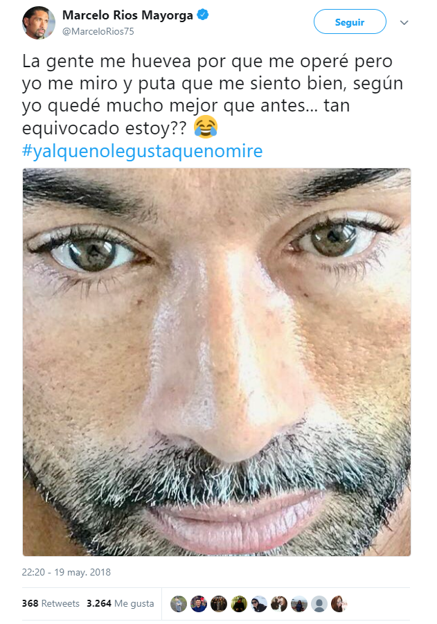 "La gente me huevea por que me operé pero yo me miro y puta que me siento bien, según yo quedé mucho mejor que antes... tan equivocado estoy??", fue lo que escribió el ex número uno del tenis. Agregando el hashtag #yalquenolegustaquenomire.