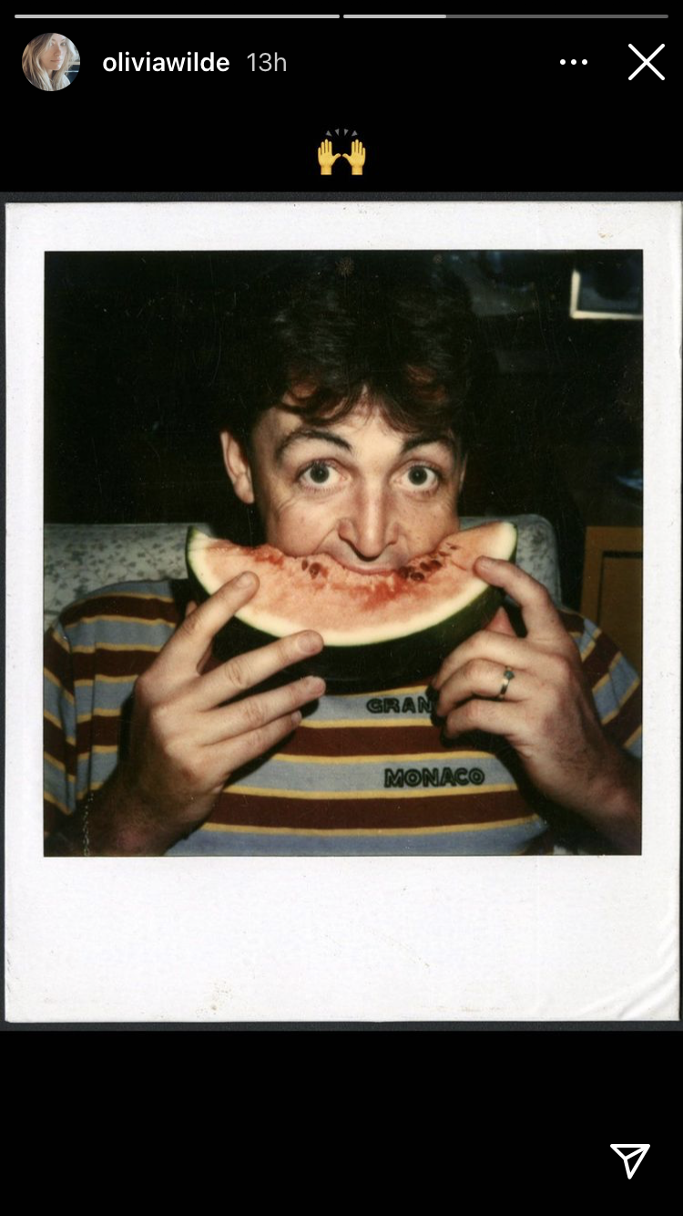 Pero ella lo hizo de una ingeniosa manera. Para felicitar a su pareja, subió a sus historias de Instagram una foto de Paul McCartney, donde está comiendo un pedazo de sandía, fruta que lleva el nombre de la canción de Harry Styles.