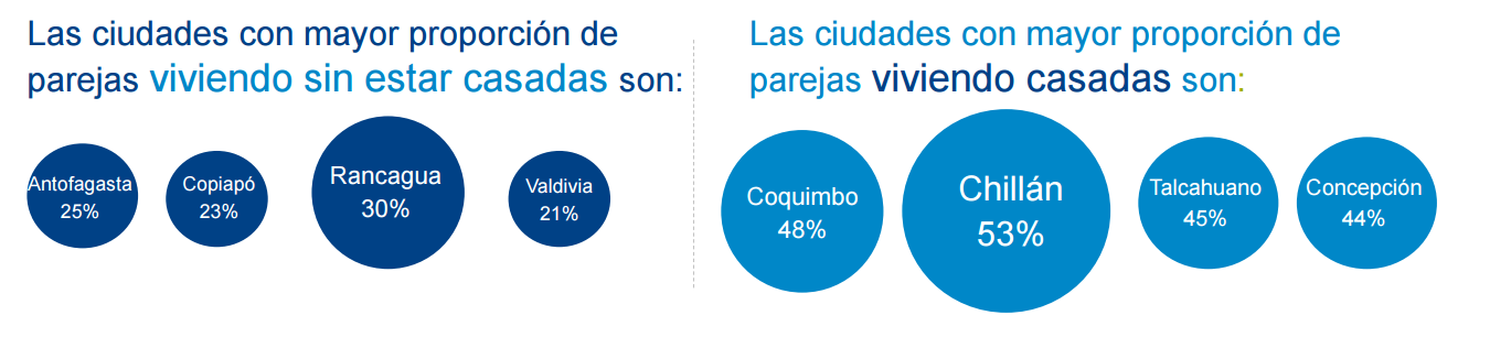 Las ciudades donde hay más proporción de personas que viven en pareja sin estar casadas son Rancagua, Antofagasta, Copiapó y Valdivia.