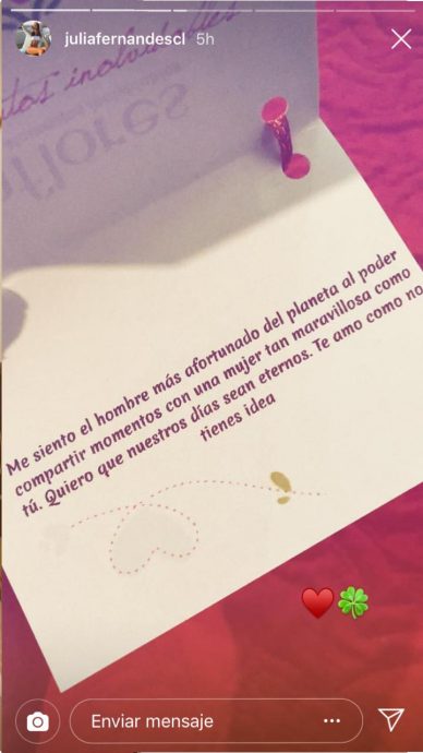 Durante la jornada, la ex chica reality sorprendió a sus seguidores al compartir una romántica carta recibida de parte de su pareja. “Me siento el hombre más afortunado del planeta al poder compartir momentos con una mujer tan maravillosa como tú. Quiero que nuestros días sean eternos, te amo como no tienes idea”, se puede leer en el mensaje.