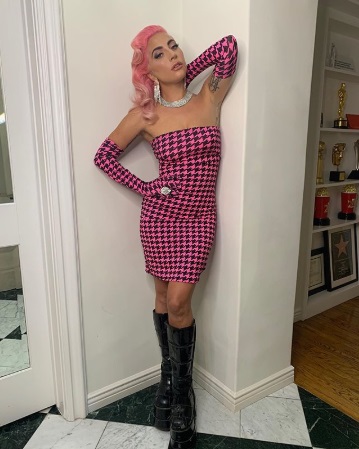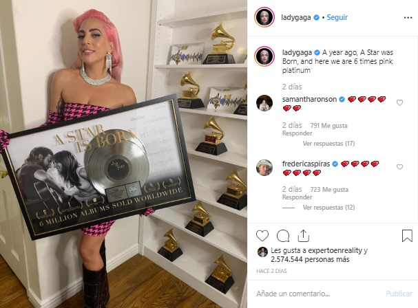 'Hace un año, 'Star was born' y aquí estamos seis veces platino rosa', escribió Gaga aludiendo también a su new look.