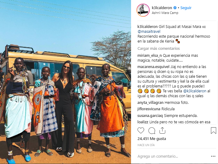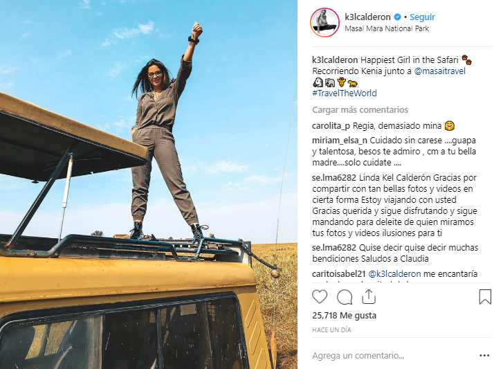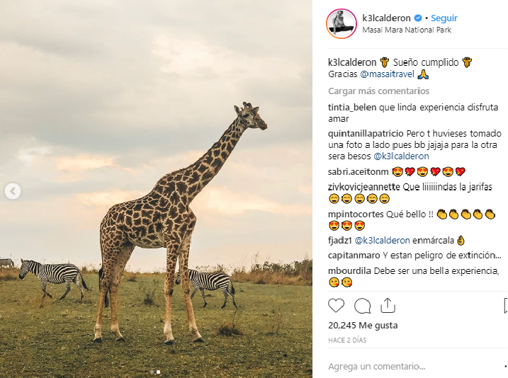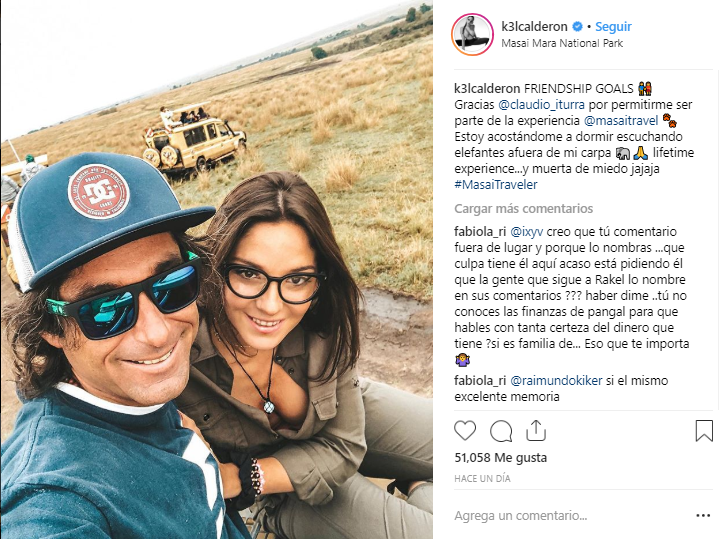 Por su parte, Iturra no se quedó atrás: "Para escribir palabras para esto, se tiene que empezar con amor, mucho cariño, una hermosa fantasía de viajeros siendo felices por el mundo de Masaitravel. Hoy vimos elefantes cruzarse delante de nosotros, hienas, jirafas y leones que parecían dóciles frente a sus lamidos. Hoy vivimos un hermoso sueño, llamado Masai Mara, en el corazón de África. Gracias Kel Calderón por seguir confiando en nosotros, te quiero y tú sabes cuánto. Gracias por apañarme en todas mis locuras. Seguimos viajando".