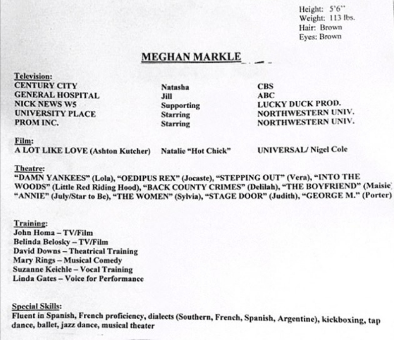 Según detalla The Daily Mail, el currículum que Meghan utilizó a principios de su carrera como actriz, enumera sus roles televisivos en las series "Hospital General" de ABC en 2001 y "Century City" de CBS en 2004, además de su papel como Natalie en la película "A Lot Like Love" del 2005, en la que apareció junto al famoso actor Ashton Kutcher.