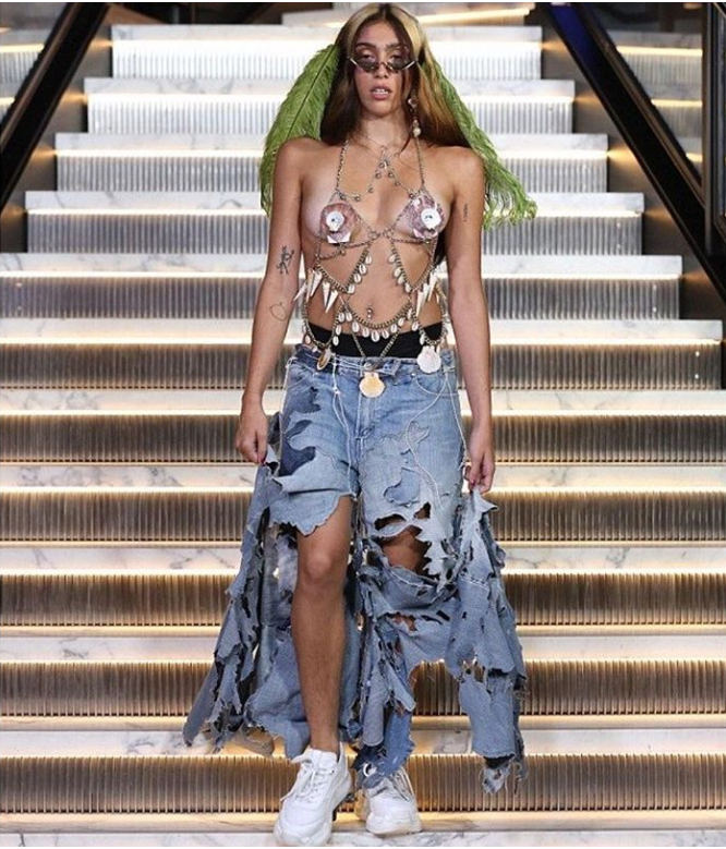 La hija de Madonna lució una especie de bikini hechos con cadenas y conchas naturales que cubrían mínimamente sus pechos, con unos pantalones vaqueros rotos, que dejaron a la vista su ropa interior. También tenía unas gafas de sol y unas plumas verdes sobre su cabeza. Pero el detalle que más miradas se robó fueron sus piernas sin depilar.