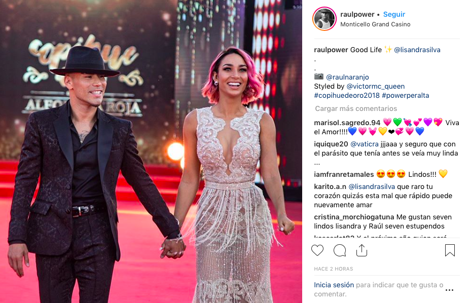 De la mano de su pareja, el bailarín Raúl Peralta, la modelo cubana Lisandra Silva se lució durante su paso en la alfombra roja de los premios Copihue de Oro.