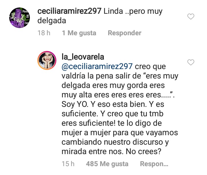 'Yo creo que valdría la pena salir de “eres muy delgada, eres muy gorda, eres muy alta, eres eres eres eres.....”. Soy YO. Y eso está bien. Y es suficiente. Y creo que tu también eres suficiente!'.