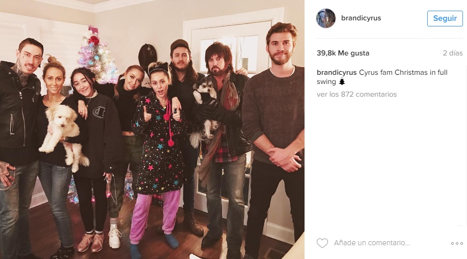 Por lo mismo, ambos llegaron a disfrutar la víspera navideña con la familia de la cantante estadounidense. La misma hermana de Miley, Brandi, fue quien publicó la imagen del clan completo, instalados entorno al árbol de Navidad. "La familia Cyrus llena del espíritu navideño", escribió al lado de la fotografía en la que se rodea de todos sus hermanos.