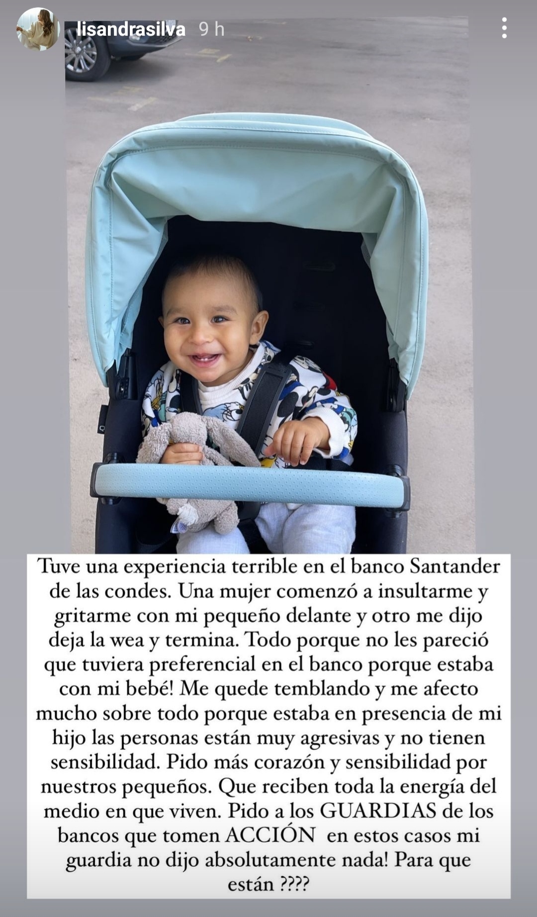 'Tuve una experiencia terrible. Una mujer comenzó a insultarme y gritarme con mi pequeño delante y otro me dijo 'deja la wea y termina'. Todo, porque no les pareció que tuviera preferencial en el banco porque estaba con mi bebé', comenzó relatando Lisandra.