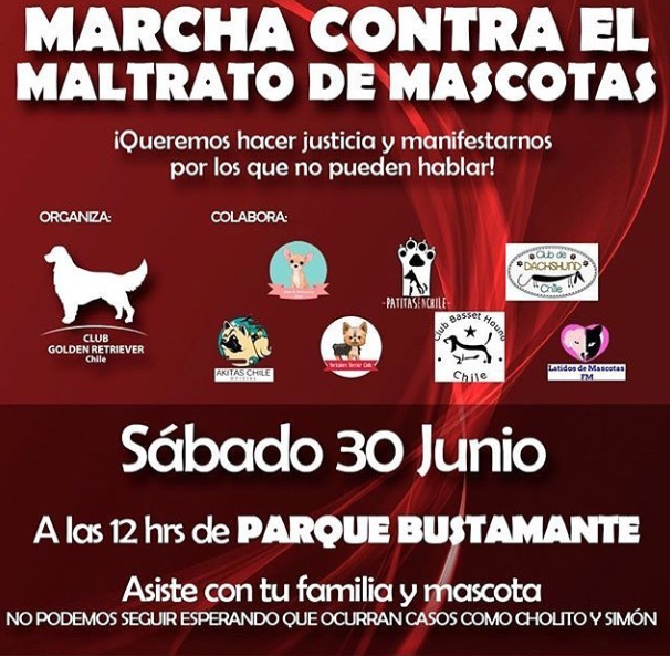 El anuncio que invita a esta marcha menciona "¡Queremos hacer justicia y manifestarnos por los que no pueden hablar!". "Asiste con tu familia y mascota. No podemos seguir esperando que ocurran casos como el de Cholito y Simón".Continúa diciendo el cartel, haciendo referencia a lo ocurrido esta semana en La Florida, cuando un grupo de personas golpearon y maltrataron a un perro hasta matarlo.