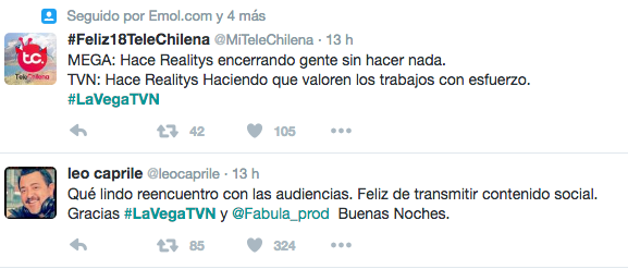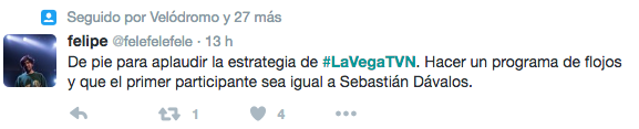 A ello se suma que el programa se transformó en pocos minutos en uno de los temas más comentados en Twitter, llegando a ser primera tendencia a nivel nacional, e incluso entrar entre lo más comentado a nivel mundial con la etiqueta #LaVegaTVN.