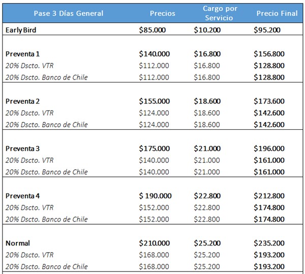 El mismo 12 de agosto, al mediodía, se venderán 200 entradas "Early bird" (máximo 2 tickets) y 300 pases de Preventa General 1 (máximo 4 tickets), al mismo valor anteriormente mencionado.