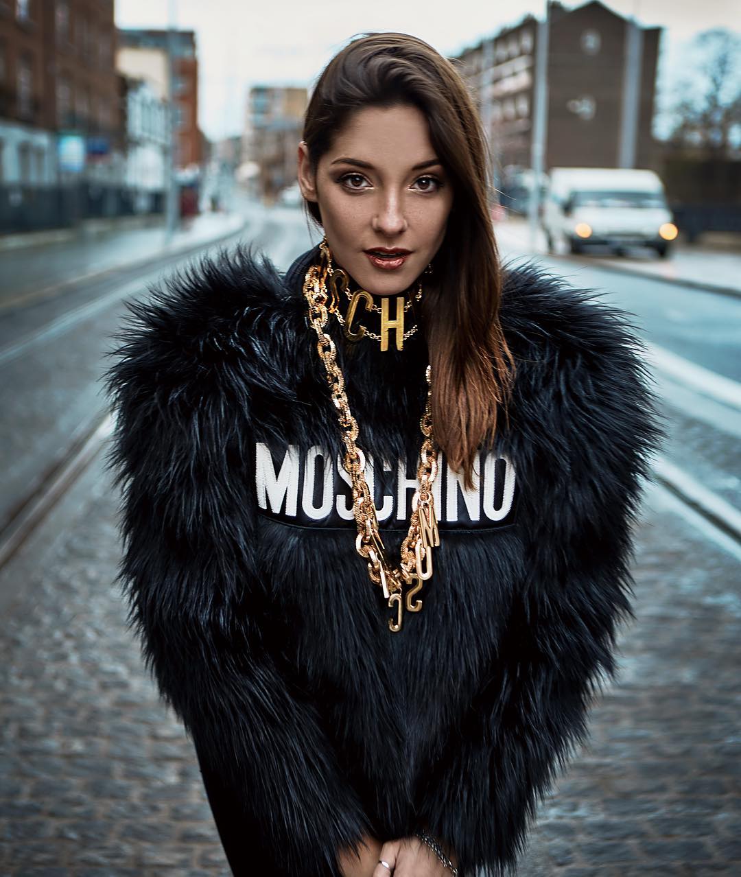 La hija de Raquel Argandoña luce un chaleco negro y peludo al revés (con la espalda hacia adelante) y una serie de pesados accesorios dorados. Todo el outfit corresponde a la colección Moschino para H&M, de la cual Calderón es embajadora.