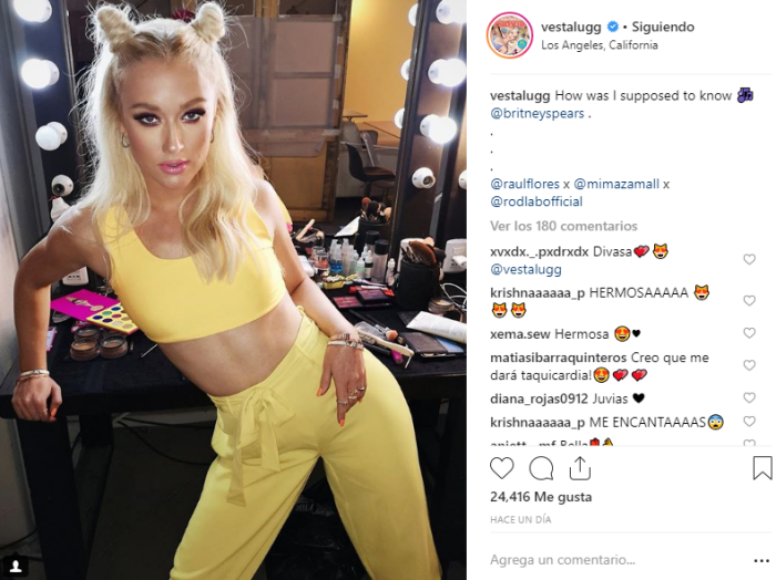 "How was I supposed to know", escribió Vesta en la publicación, incluso etiquetando a la misma Britney. La cantante utilizó un peto y pantalón amarillo para imitar la apariencia de la artista estadounidense en sus primeros discos.