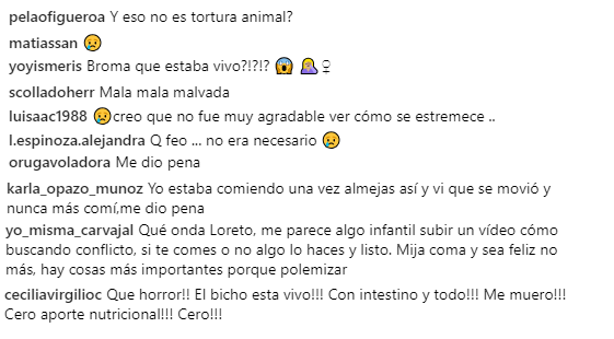 No todos sus seguidores se mostraron de acuerdo con el actuar de la intérprete de "Sussy" en "Soltera Otra Vez", asegurando que lo que mostraba era tortura animal y que el molusco claramente seguía vivo.