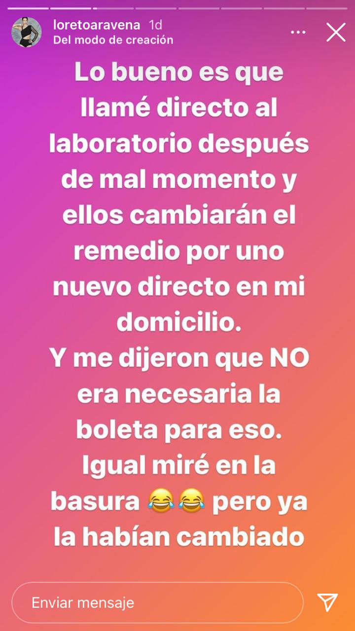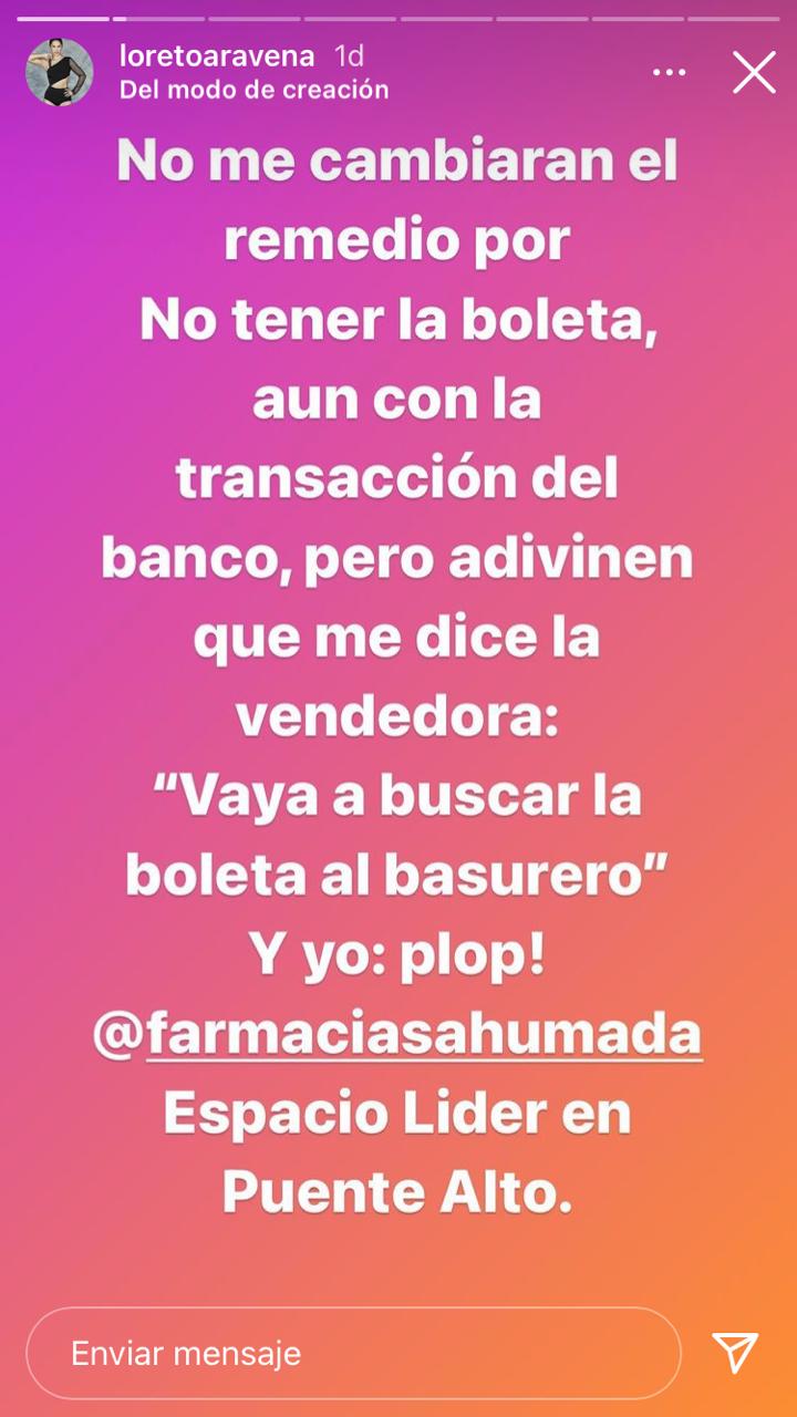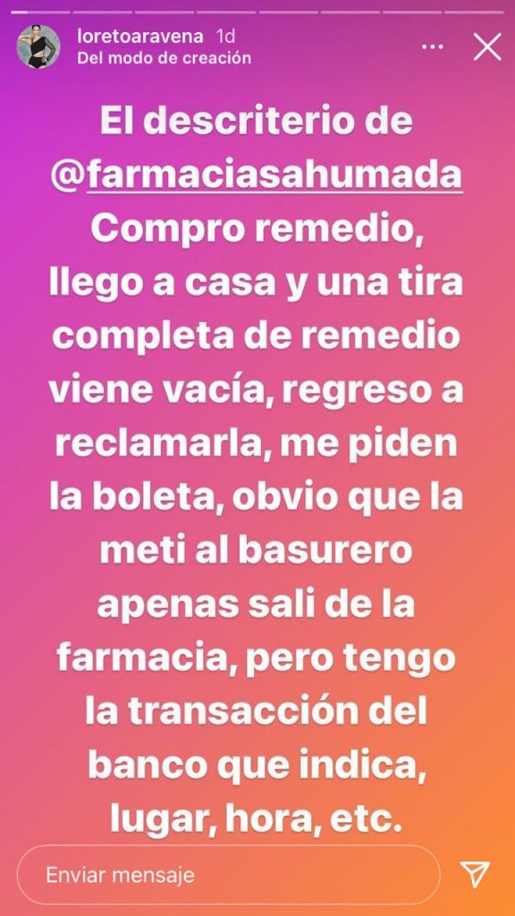 Y es que en una serie de historias comenzó escribiendo: "El descriterio de esta farmacia. Compro un remedio, llego a casa y una tira completa de remedio viene vacía. Regreso a reclamarla y me piden la boleta. Obvio que la metí a la basurero apenas salí de la farmacia, pero la transacción del banco que indica lugar, hora, etc".