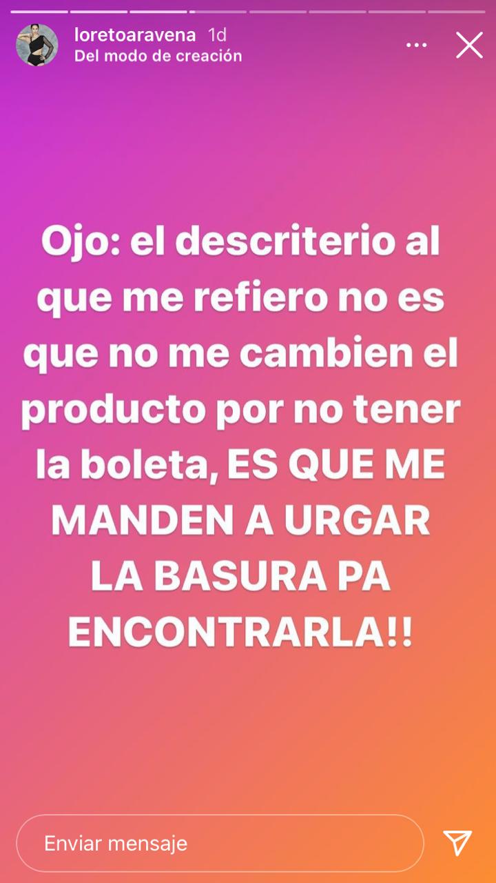 En ese contexto, agregó que "no me cambiarán el remedio por no tener la boleta...pero adivinen qué me dice la vendedora: ‘vaya a buscar la boleta al basurero'". Y, a su vez Loreto Aravena recalcó que "el descriterio al que me refiero no es que no me cambien el producto por no tener la boleta, es que me manda a hurgar la basura para buscarla".