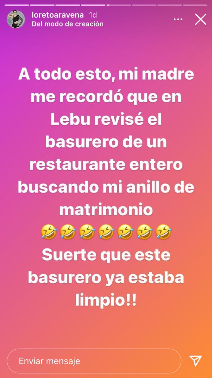 Debido al problema que evidenció, Loreto Aravena decidió llamar al laboratorio del medicamento, desde donde le indicaron que se lo cambiarán y hasta se lo enviarán al domicilio. Y, después de pasar este mal rato, la actriz bromeó con un recuerdo relacionado a su anillo de compromiso.