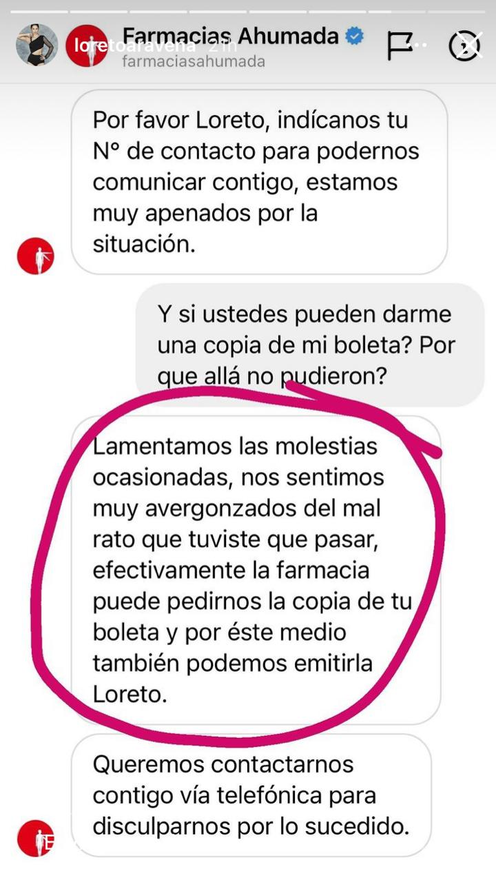 Finalmente, unas horas después, Loreto Aravena recibió una respuesta por mensaje directo de la farmacia Ahumada, donde expresaban sus disculpas por lo ocurrido.