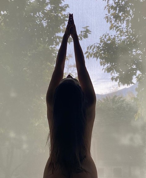 "Respira", escribió Loreto junto a la postal, la cual subió justo después de las lluvias en la zona central. En la foto se le puede ver de espaldas realizando una postura de yoga en medio de un entorno natural.