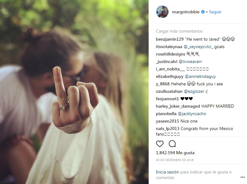 La actriz quien interpreta a "Harley Queen" anunció que se había casado a través de sus redes sociales. Robbie sólo publicó una foto del anillo.