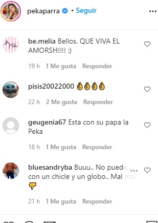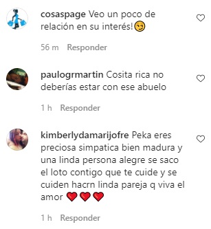 Igualmente, hay varios de los seguidores de la actriz que la defienden y celebran su relación. "Peka sigue siendo feliz el amor verdadero no tiene condición social, edad, color e incluso sexo. El amor es universal, sigan amándose como siempre, como nunca, como hoy y como mañana, sigan sonriendo y siendo felices hoy y siempre ,y sobre todo sigan amándose, apesar de lo que digan los que no saben amarse a sí mismos y menos al prójimo, por lo tanto no respetan ni valoran la felicidad", dijo una usuaria.