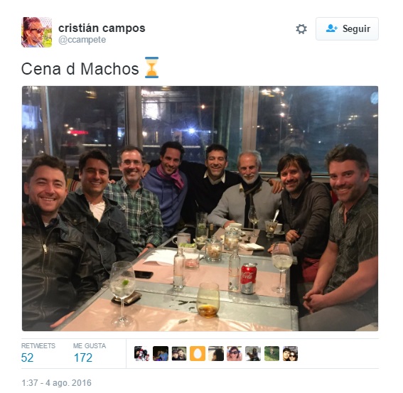 Esto ha quedado demostrado a través de fotografías como la que anoche compartió Campos en Twitter, donde se ve a los guapetones disfrutando de una cena todos juntos.