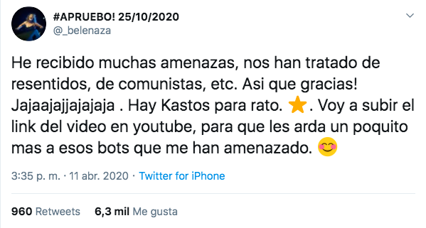 Es el caso de Belén Mora y su pareja "Toto" Acuña quienes hicieron una parodia dirigida a todos quienes infringen la cuarentena y se fueron a la playa durante este fin de semana extendido de semana santa. Esta parodia fue muy aplaudida por sus seguidores, pero hubo algunos a quienes sacó ronchas. Así lo comunicó Belén Mora en sus redes sociales, que hasta amenazas había recibido.