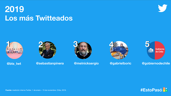 ¿Quienes fueron los más twitteados? El primer lugar de la plataforma, se lo lleva la banda surcorenada BTS, seguidos por Sebastián Piñera, Sergio Melnick, Gabriel Boric y Gobierno de Chile.