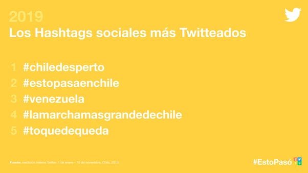 Con respecto a los hastag que marcaron lo más twitteado, el número uno es #ChileDesperto, seguido de #estopasaenchile, #venezuela, #lamarchamasgrandedechile y #toquedequeda.