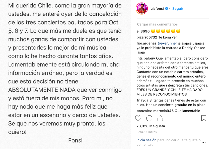 A través de sus redes sociales, Luis Fonsi reveló que se enteró esta semana de la cancelación de los 3 shows que daría en nuestro país, los días 5 de octubre en Antofagasta, el 6 en el Concepción y el 7 en Santiago junto a Daddy Yankee.