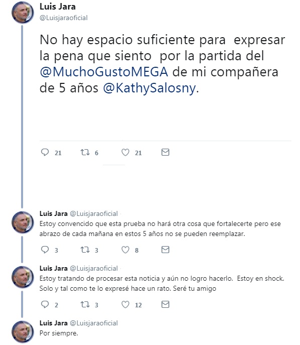 Ante su salida, diversos compañeros enviaron su apoyo públicamente para despedirla tras tanto tiempo a la cabeza del matinal. Uno de ellos fue Luis Jara, con quien compartió por largos años cada mañana. "No hay espacio suficiente para expresar la pena que siento por la partida del 'Mucho gusto' de mi compañera de 5 años Kathy Salosny. Estoy convencido que esta prueba no hará otra cosa que fortalecerte, pero ese abrazo de cada mañana en estos 5 años no se puede reemplazar. Estoy tratando de procesar esta noticia y aún no logro hacerlo. Estoy en shock. Solo y tal como te lo expresé hace un rato. Seré tu amigo por siempre", expresó a través de su cuenta Twitter.