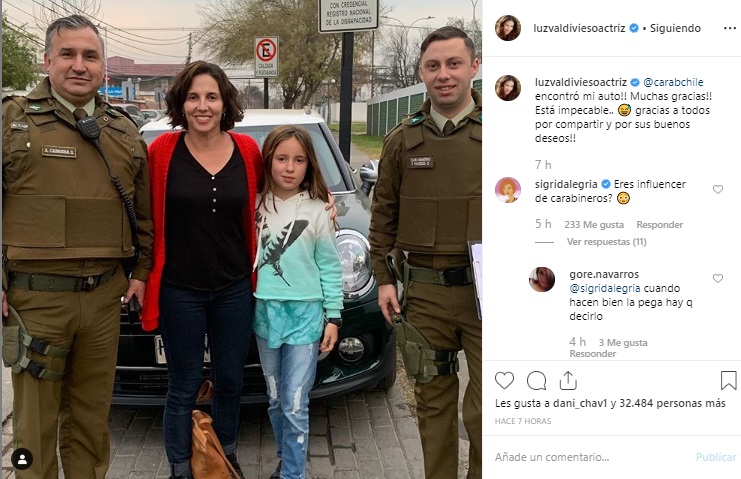 'Carabineros encontró mi auto!! Muchas gracias!! Está impecable.. 😅 gracias a todos por compartir y por sus buenos deseos!!', escribió la actriz.
