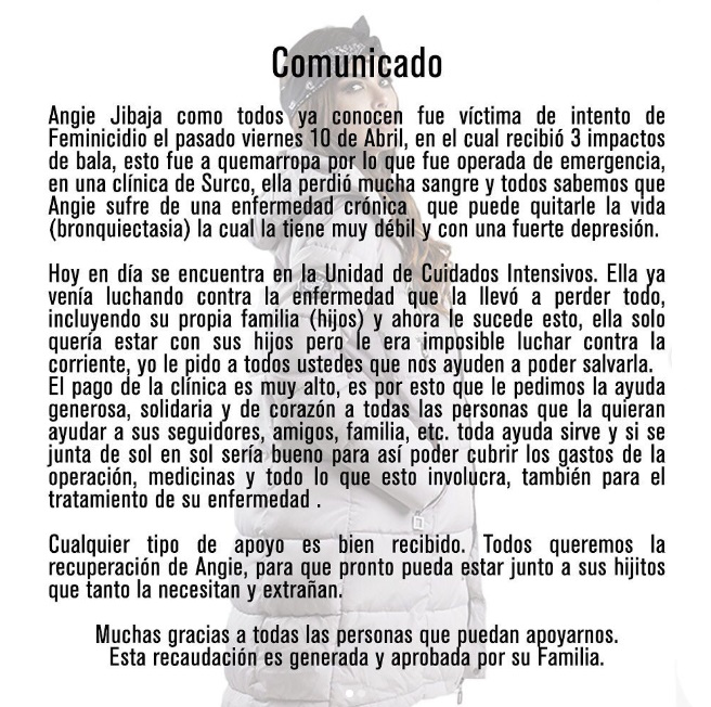"Pedimos el apoyo de todos los amigos y fans de Angie para la colaboración y difusión… En estos momentos necesitamos la ayuda de todos, el costo de la clínica es realmente alto y necesitamos cubrir estos gastos y del tratamiento que reciba Angie… Comprendemos el trágico momento que está pasando el mundo, pero nadie está libre de una desgracia", señaló Liza.