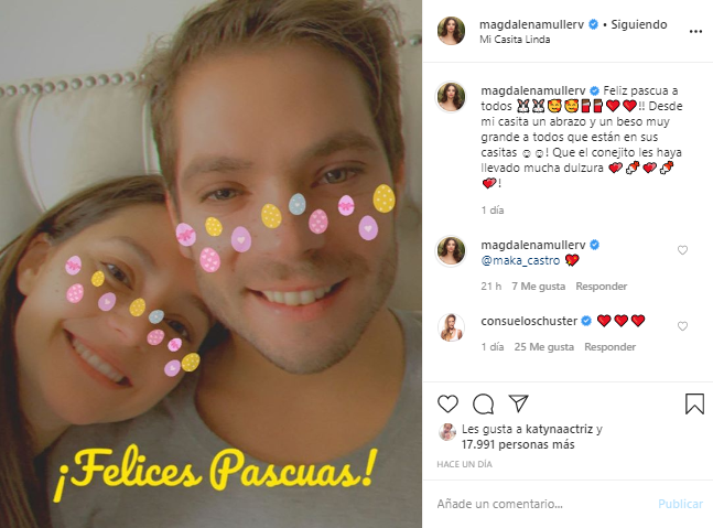 'Feliz pascua a todos 🐰🐰🥰🥰🍫🍫❤️❤️!! Desde mi casita un abrazo y un beso muy grande a todos que están en sus casitas! Que el conejito les haya llevado mucha dulzura', escribió Magdalena para acompañar la imagen.