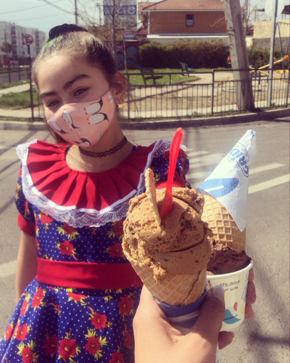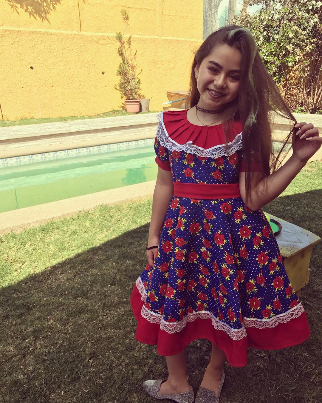 Eso sí, la intérprete de 11 años sorprendió al modernizar el traje típico, pues llevó su pelo suelto y con su mechón rubio, en vez de las clásicas trenzas. Además complementó su vestido de huasa floreado en tonos azules y rojos con unas ballerinas brillantes y un choker negro.