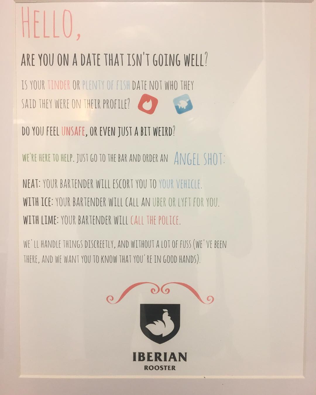 "¿Tu cita no está saliendo muy bien?, ¿No es realmente el hombre del perfil de Tinder?, ¿Te sientes insegura o incluso rara por esto?", dice el letrero con el que se explica el método de escape donde lo único que se debe hacer es ir hacia la barra del local y pedir un "Angel Shot".