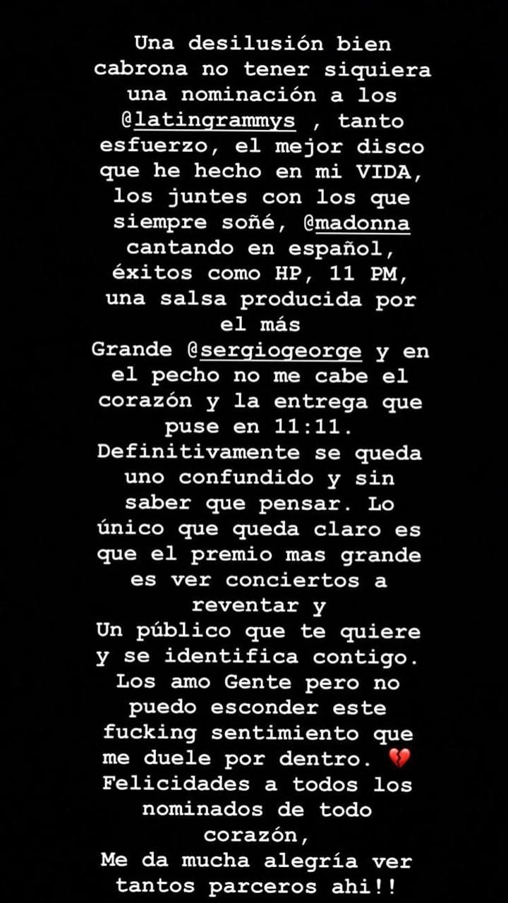 "Una desilusión bien cabrona no tener siquiera una nominación a los @latingrammys", comenzó escribiendo Maluma en un mensaje que compartió a través de las historias de su Instagram.